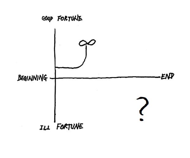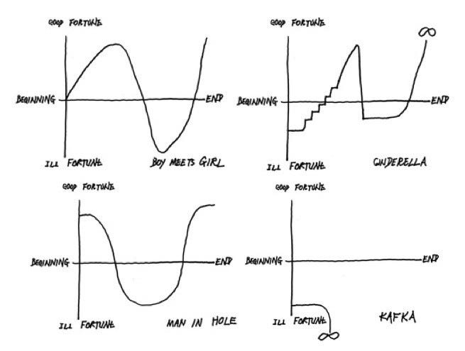 Every year in my Intro to Creative Writing Class I have the students read an essay by Kurt Vonnegut where he talks about plot and how a story can be charted on a graph, with the X-Axis going from Beginning to End, and the Y-Axis going from Good Fortune to Ill Fortune.