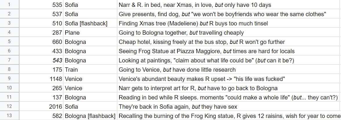“The Frog King” is divided into thirteen sections separated by line breaks, indicating a scene change. I first traced the story’s geography. It begins in Sofia, moves to Bologna, then Venice, and then back to Bologna, and finally they return to Sofia. It’s a good shape for a story about two travelers. They go out and then come back the same way. Simple enough.