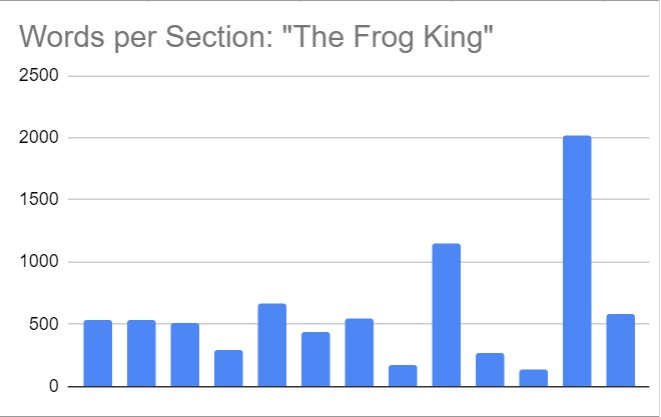 The first three sections, all in Sofia before leaving, are nearly identical in length. I thought of this as the story’s base-rate, around 520 words per section.